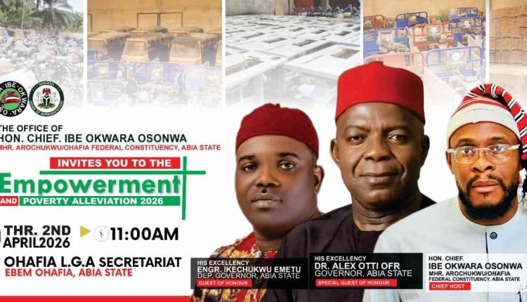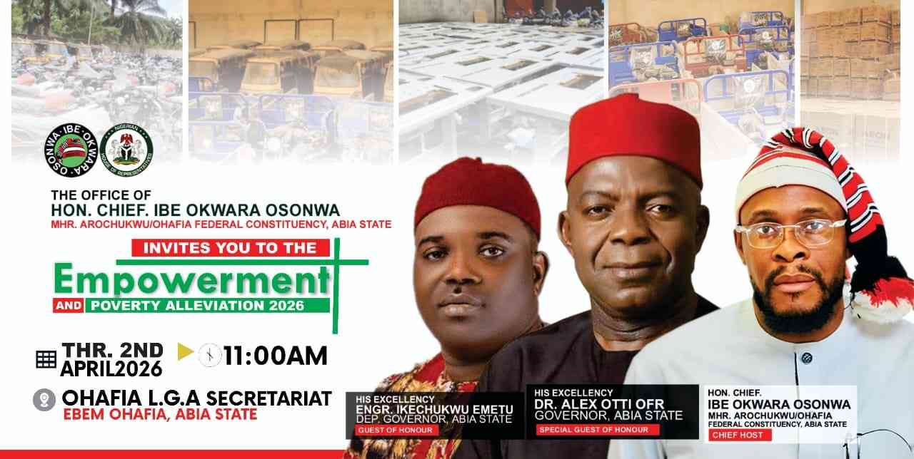 The empowerment initiative, scheduled to hold on Thursday, April 2, 2026, by 11:00am at the Ohafia Local Government Area Secretariat, Ebem Ohafia, is aimed at strengthening livelihoods, supporting small businesses, and reducing poverty across the constituency.
